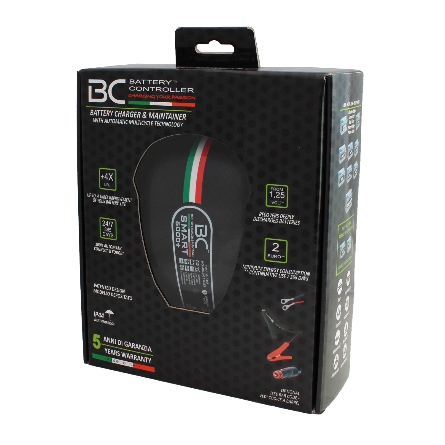 chargeurs et mainteneurs de bureau de la gamme de contrôleur de batterie BC étant entièrement automatique peut rester connecté à la batterie 24 heures par jour / 7 jours sur 7 pendant des mois, même des années tout à fait sain et sauf. A l'intérieur de la boîte sont les pinces confortables et pratiques de montage des oeillets à gauche fixé au véhicule. Dot ato également une « barre de LED intuitive, ce qui garantit également une vision nocturne parfaite, BC SMART 5000+ nous fournit des informations en temps réel sur le niveau de charge de la batterie (50%, 65%, 80%, 100%) et sur le cycle exécution ainsi que sur le programme sélectionné (CAR, vélo, Start & Stop; STOP et ALIMENTATION).